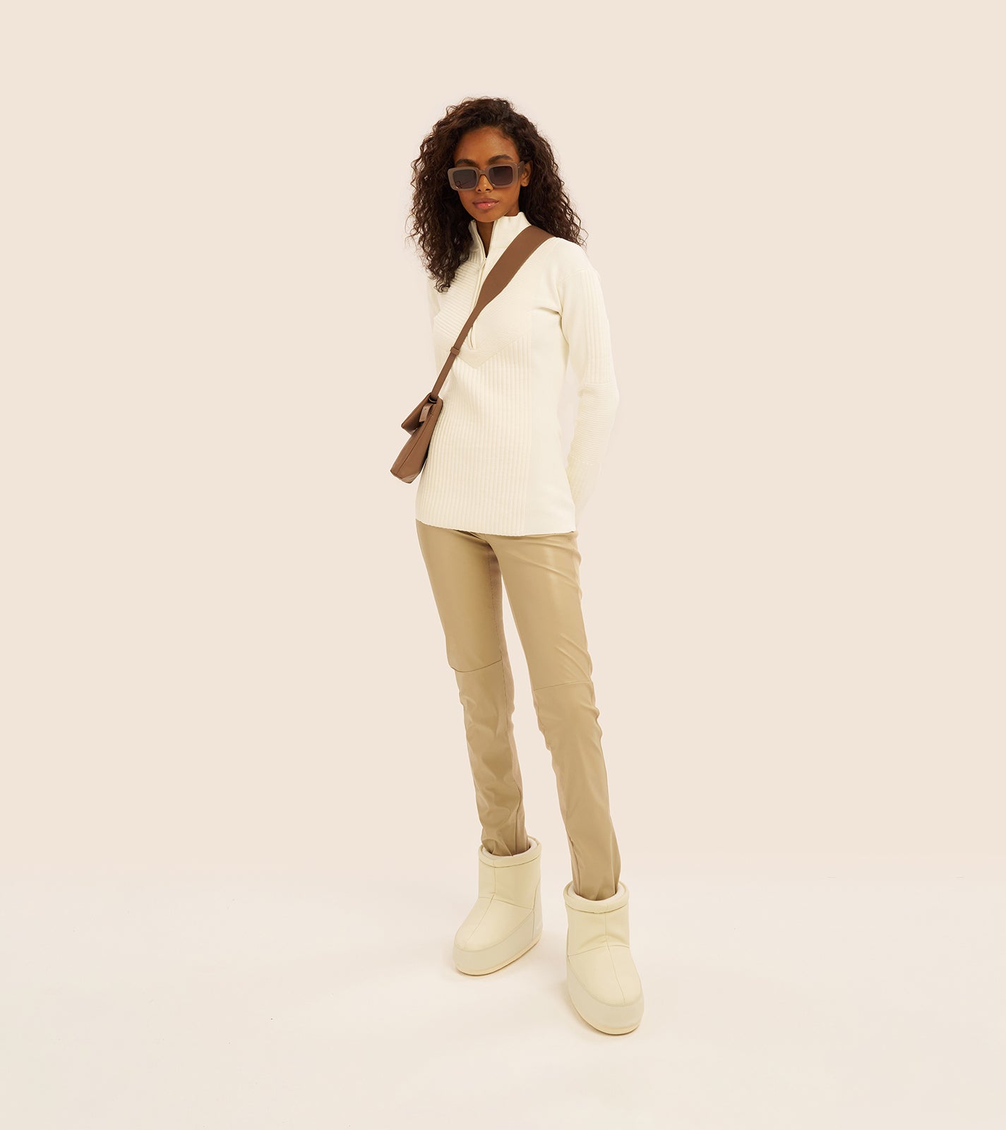 Crafted from technical stretch yarn and featuring knitted-in padding, this Half Zip Ski Sweater offers unparalleled comfort and style. Its soft texture is gentle on the skin, making it ideal for prolonged wear. The breathable material ensures you stay cool and dry, while the sweat-wicking properties keep you comfortable and focused even during intense physical activity. Perfect for après-ski and those looking to elevate their winter wardrobe.