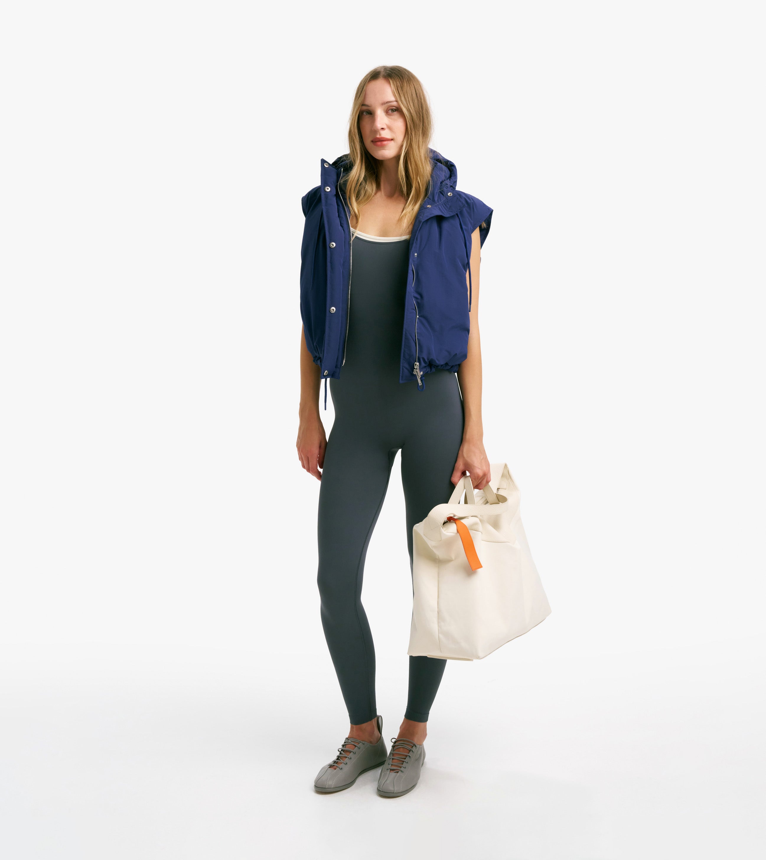 Introducing the Christie Puffer Gilet - VAARA's contemporary hooded take on this essential winter layering piece. Cut in a boxy, cropped silhouette from a technical water-repellant, recycled shell with a locally sourced, luxurious duck down insulation. Features include a snap front placket, adjustable drawstring hem, hand pockets and an inside chest pocket.