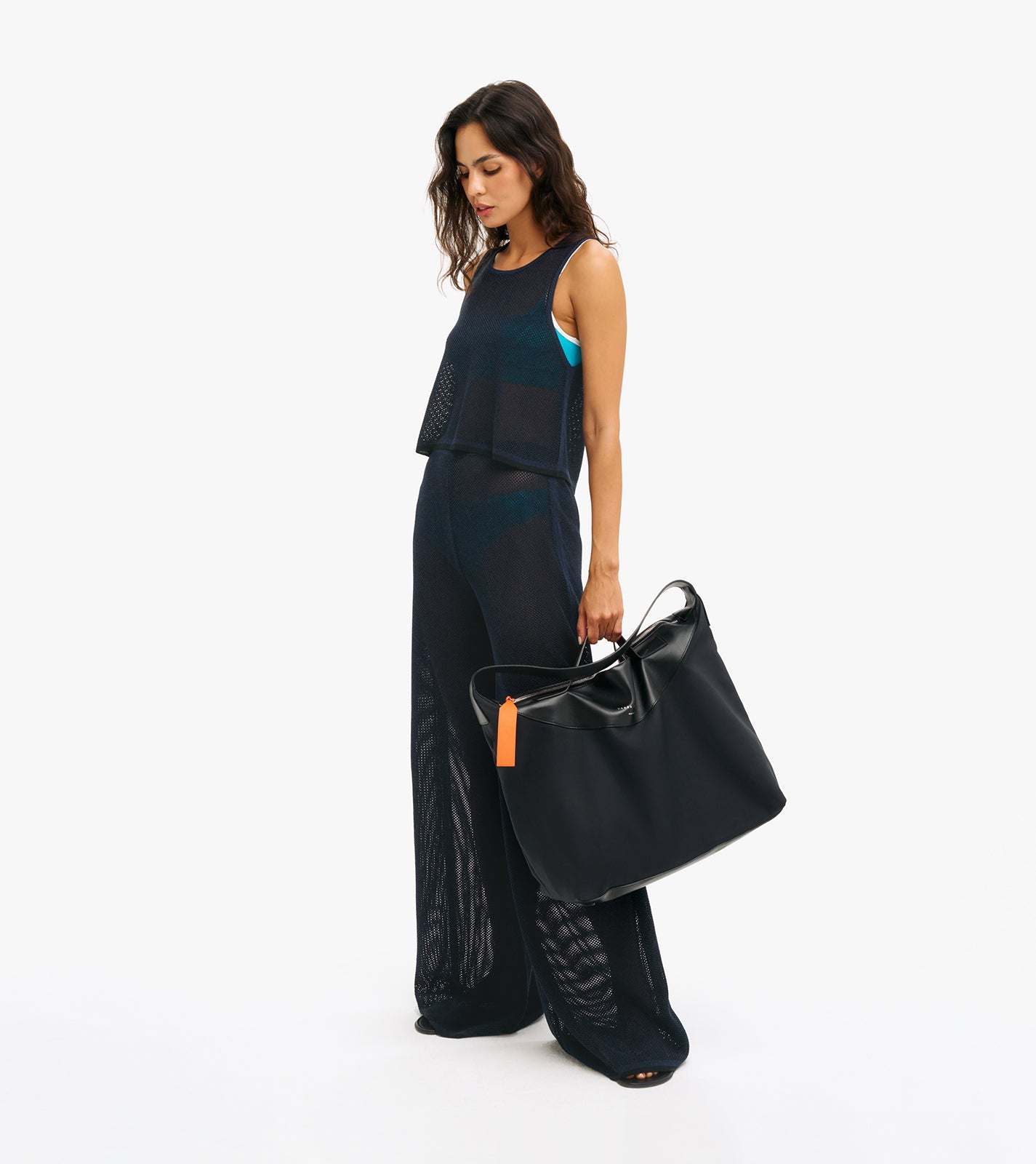 This luxurious Italian Knitted Beach Top features a crisp, smooth hand feel with a double-face mesh knit structure and a relaxed fit. The ivory and white two-tone yarn, narrow racer straps, subtle 2-tone knit, and signature VAARA 'V' at the back neck add refined elegance. Style it with the matching knitted trousers and beach bag for a coordinated, sophisticated look.
