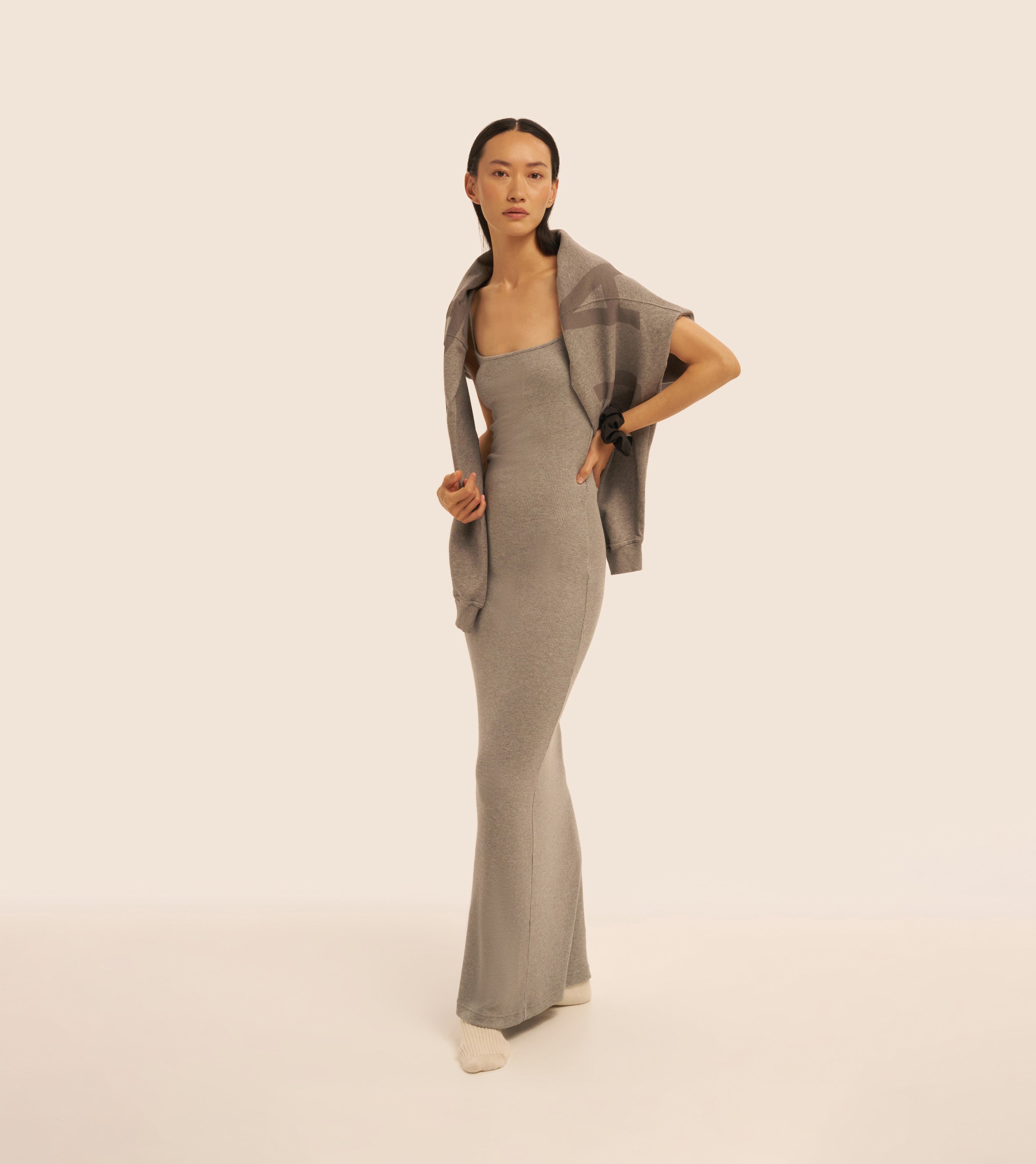 Form-flattering, minimalist and easy to walk in, the Long Square Neck Dress is fitted at the waist and hip before benefitting from a slightly wider cut towards the floor for ease of movement. It is designed with a ribbed finish and fine straps and comes in SEACELL fabric, an eco-friendly and skin-kind choice.