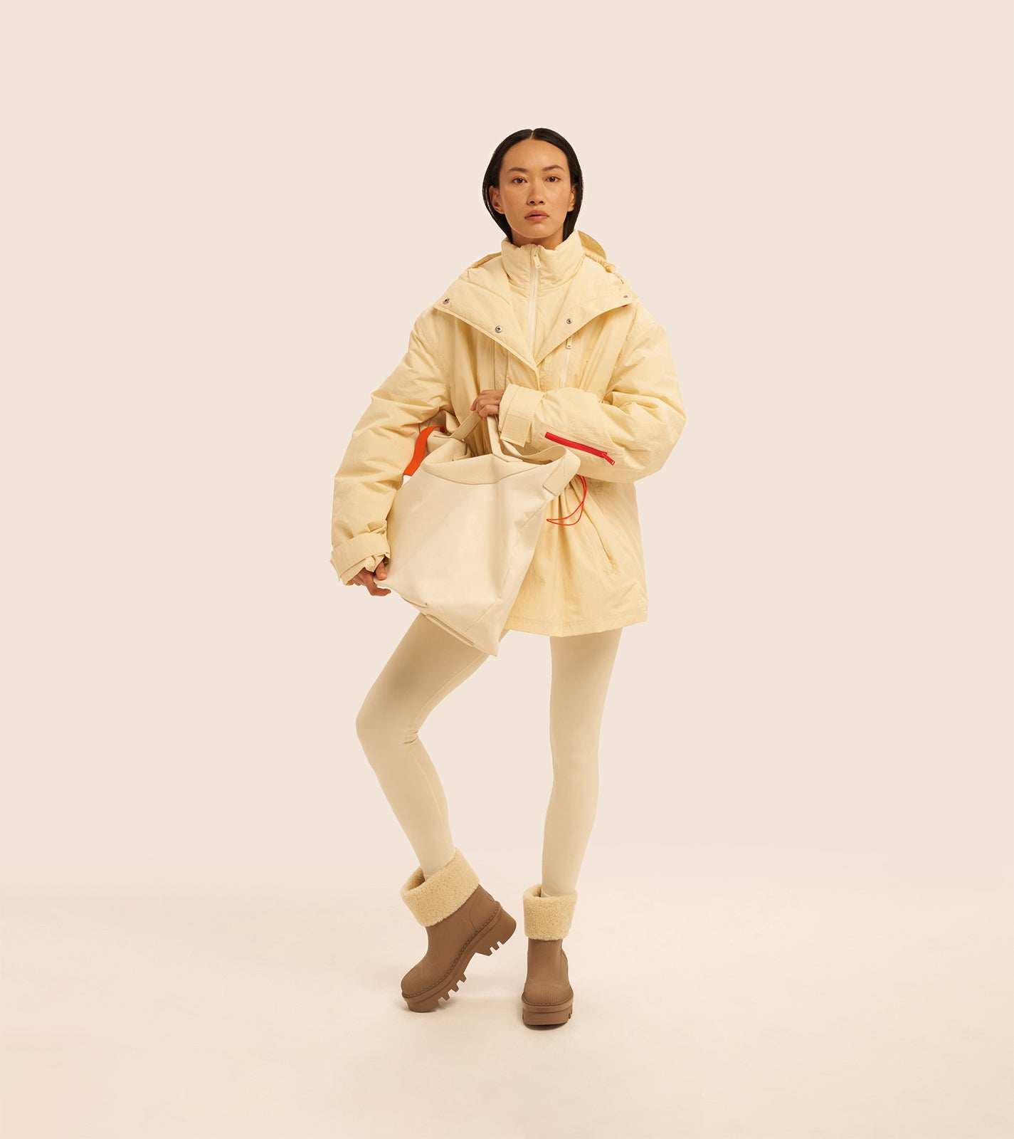 The Padded Shell Coat is a perfect blend of style and warmth. Crafted from recycled, water-repellent fabric and plush natural wool padding, it features a flattering silhouette with an oversized placket and chic VAARA coral accents. The cinch drawcord at the waist and adjustable sleeve hems enhance its elegance.